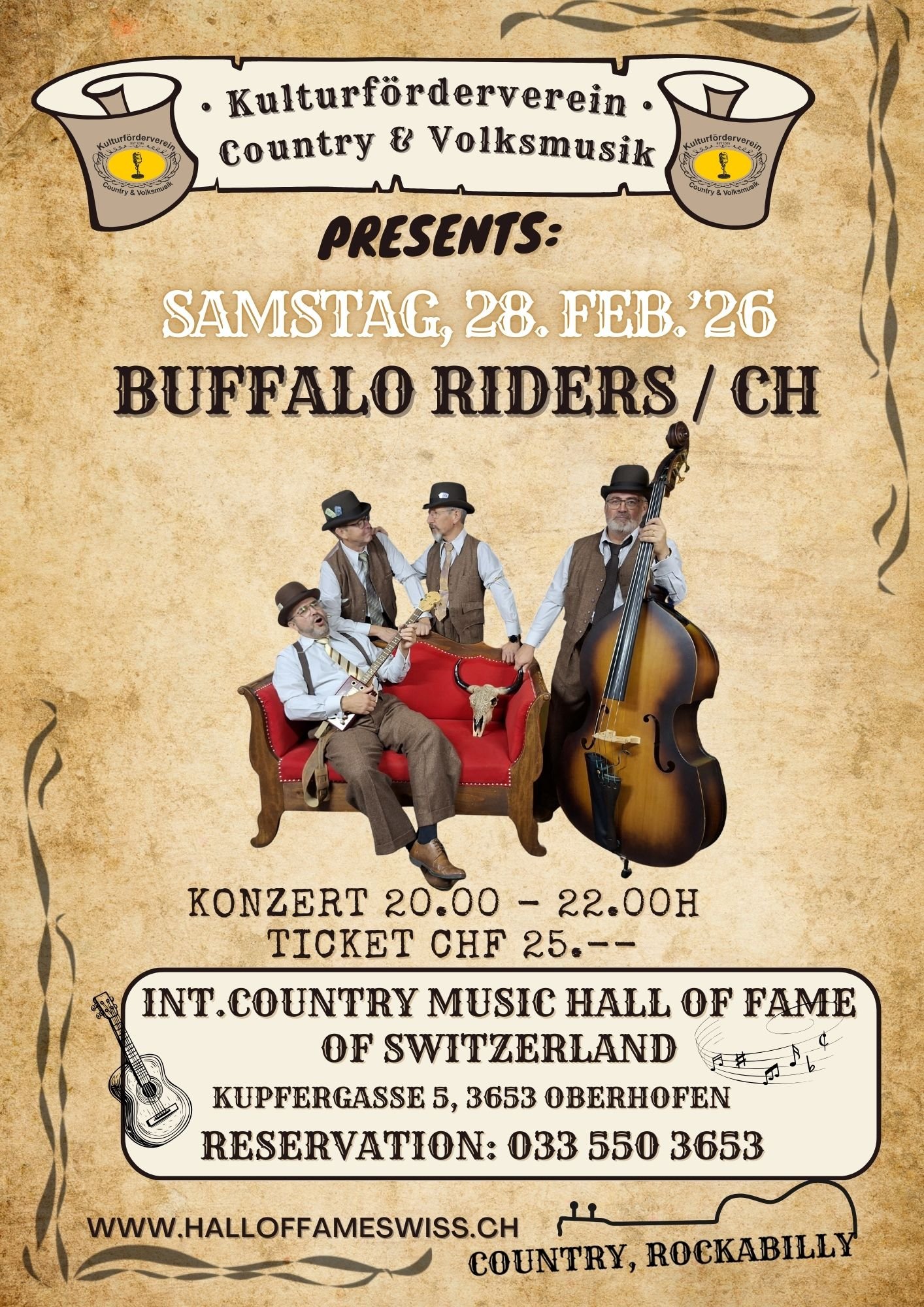 Die Buffalo Riders sind eine vierköpfige Band, deren Herz in den Tonlagen alter Country-, Rockabilly- und Honky-Tonk-Klänge schlägt. Mit Gitarre, Cigarbox-Guitar, Bluesharp, Dobro, Mandoline, Kontrabass und Perkussion kombinieren sie einen warmen, mitreissenden Sound mit virtuoser Bühnenpräsenz. Mit dem vierstimmigen Gesang verstehen sie es, ihr Publikum zu überraschen und zu begeistern.