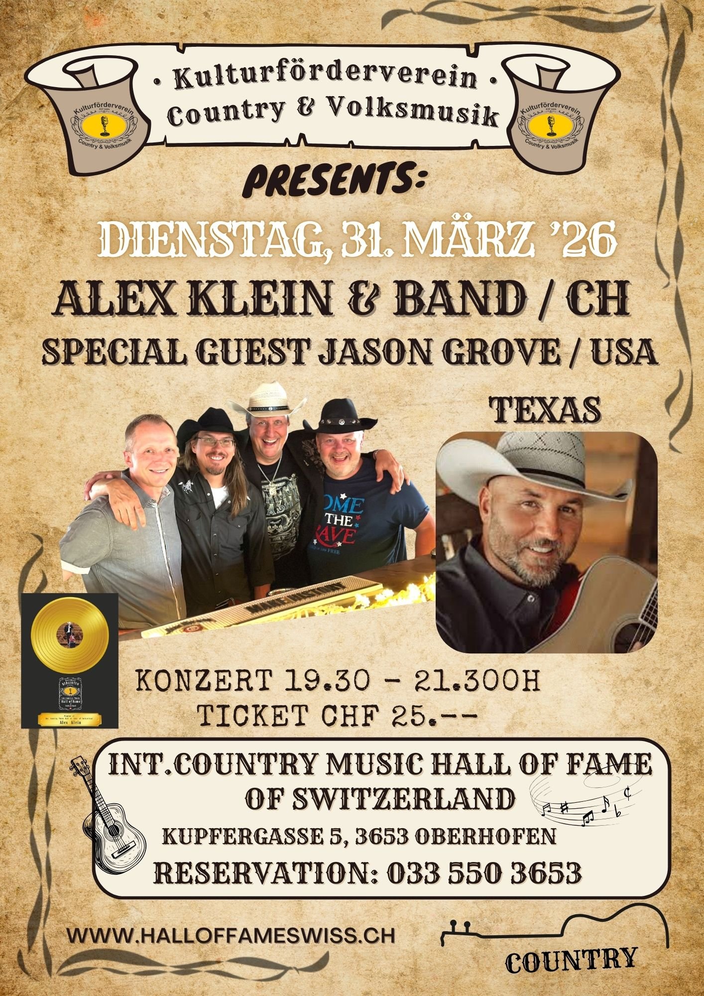 Jason hat sich eine bemerkenswerte Karriere in der Welt der traditionellen Country-Musik aufgebaut. Seine Musik zeugt von seinen tiefen Country-Wurzeln und seinem unerschütterlichen Engagement für dieses Genre. Geboren in Tennessee und heute in Fredericksburg/Texas wohnhaft, ist Jason zu einer festen Größe der texanischen Musikszene geworden, bekannt für seine authentischen und emotionalen Auftritte. Für sein Konzert im Int. Country Hall Of Fame of Switzerland wird er von den tollen Musikern der ALEX KLEIN BAND begleitet: